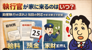 この記事では、執行官が家に来るタイミング、動産執行の流れ、当日の対応、差押えを止めるために今できることを、司法書士がわかりやすく解説します。